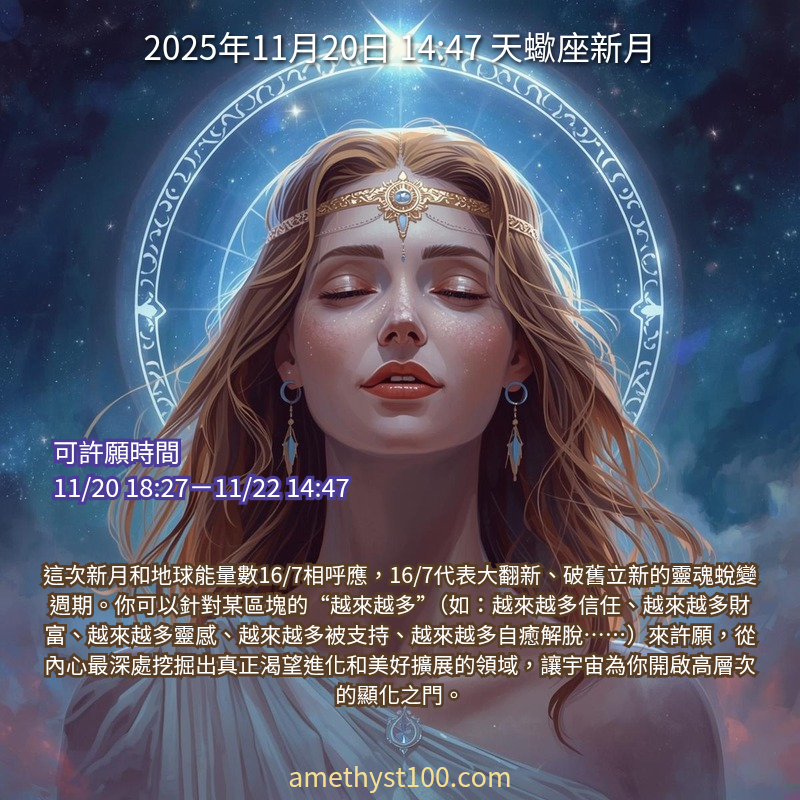 2025年11月20日 14:47 天蠍座新月✨月空亡時間(避免許願,可專注冥想)11/20 14:47-11/20 18:26🔮可許願時間11/20 18:27-11/22 14:47地球能量數=16/7🌟三天內重點星象與集體能量方向💫月亮剛進入天蠍座新月+水星逆行回天蠍,內在深度大整理,很多人會開始重新定義一段合作、男女性關係、金錢計劃或對人生的想法。⚡這幾天(20-23日)水星與太陽同時在天蠍合相,帶來深刻的洞察力和直覺靈感,但也容易翻出舊帳或接觸過去的議題,過去的人事物再現、溝通和秘密曝光機率大增。